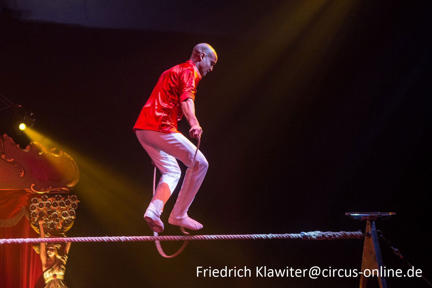 Yosvany Rodriguez aus Südamerika präsentiert eine sehr ungewöhnliche Darbietung auf dem Elastikseil: Sein Arbeitsplatz ist ein elastisches Seil, auf dem er mit vielfältigen Sprungvarianten agiert. Höhepunkt seiner Darbietung sind ein Rückwärtssalto sowie ein Vorwärtssalto, dieser über eine Barriere, beide zum Stand gesprungen.