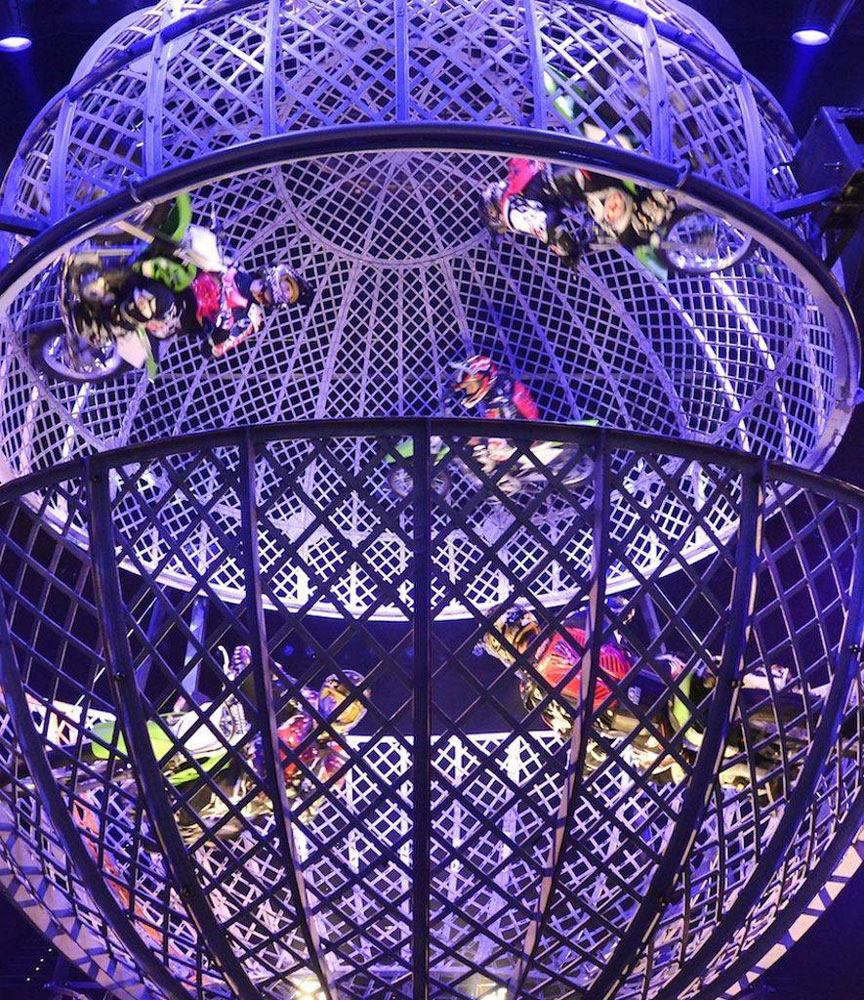 Waghalsige Aktionen in der geteilten Motorrad-Kugel mit einem Durchmesser von nur 5 Meter sorgen für Nervenkitzel pur.
